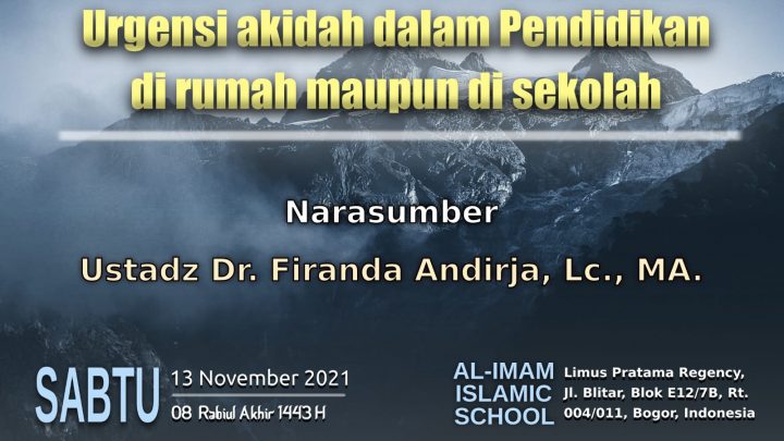 Narasumber : Ustadz Dr. Firanda Andirja, MA.Tema : Urgensi Akidah Dalam Pendidikan di Rumah Maupun di SekolahHari, Tanggal : Sabtu 13 November 2021/8 Rabiul Akhir 1443HVia : Zoom & Youtube Channel Al-Imam Islamic School