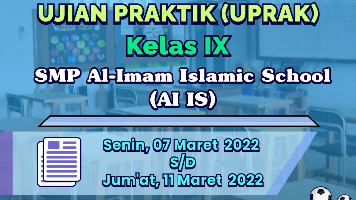 Al-Imam Islamic School akan melaksanakan ujian praktik untuk jenjang SMP kelas IX yang akan dilaksanakan pada tanggal 07 Maret 2022 S/D Jum’at, 11 Maret 2022 secara online dan offline.