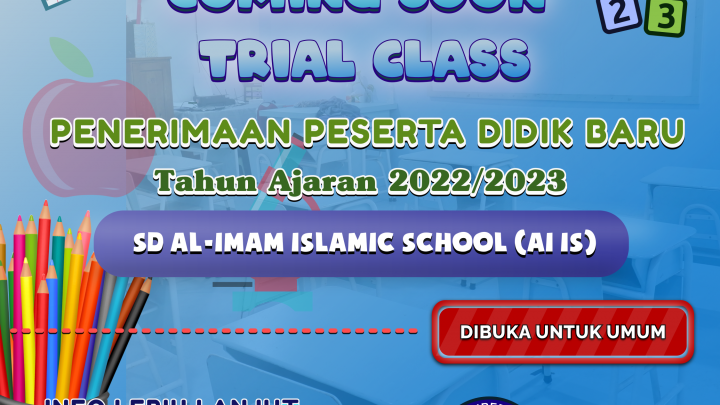 Assalamu’alaikum warhmatullahi wabaraktuh. InsyaAllah, segera hadir Trial Class Penerimaan Peserta Didik Baru tahun ajaran 2022/2023 untuk jenjang SD Al-Imam Islamic School (AI IS). Trial Class ini dibuka untuk umum dan untuk info selengkapnya silakan hubungi Bu Wiwin di nomor berikut : 081317103845.——————Ingin tahu lebih banyak dan informasi lainnya mengenai Al-Imam Islamic School? Jangan lupa ikuti…
