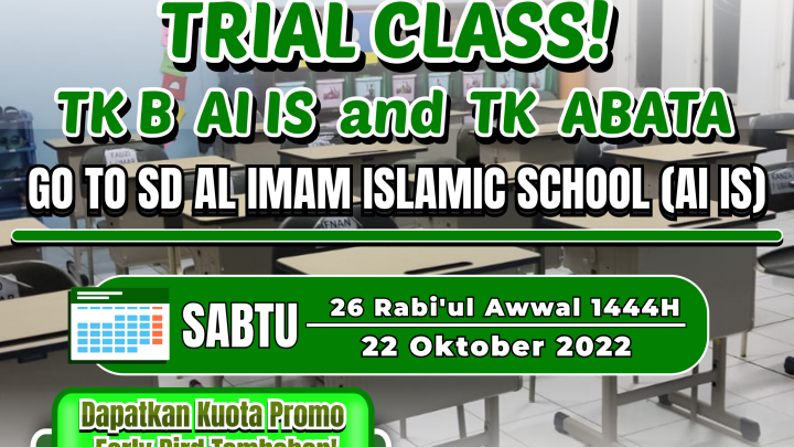 InsyaAllaah pada hari Sabtu, 26 Rabi’ul Awwal 1444H , TK B Al-Imam Islamic School dan TK Abata akan melaksanakan kegiatan Trial Class Ke SD Al-Imam Islamic School (AI IS).